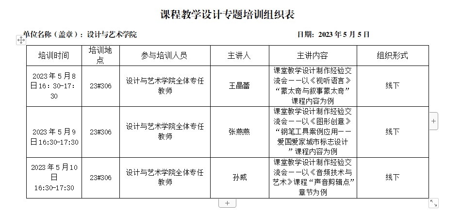 根据《HAHA体育关于进一步深化课堂教学改革工作的实施方案》要求,近期公司将启动优秀课程教学设计评选工作。 为进一步提高教学设计质量,公司将于5月8日-10日开展课程教学设计专题培训,现将有关事项通知如下: