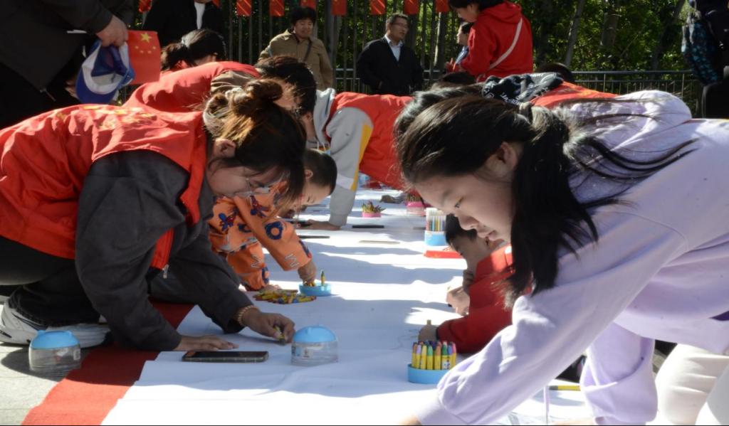活动当天,同学们身着统一的服装,手持鲜艳的小国旗,身贴精心设计的国庆主题贴纸,脸上洋溢着对祖国的热爱与祝福。他们满怀激情地投入到绘画创作中,一幅长达百米的画布成为了他们共同挥洒创意的舞台。同学们挥毫泼墨,用画笔勾勒出祖国的壮丽山河,用色彩渲染出节日的喜庆氛围。同时,他们还耐心指导小朋友们完成了一幅幅充满童趣与创意的画作,这些作品不仅展现了孩子们的天真与想象,更传递了对祖国的深情厚谊。